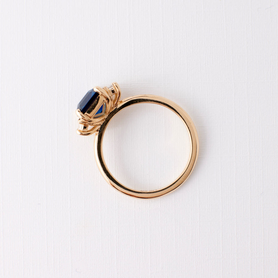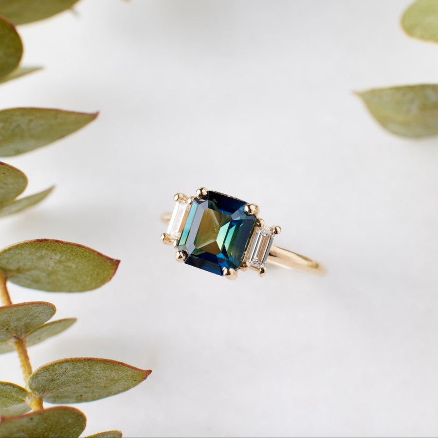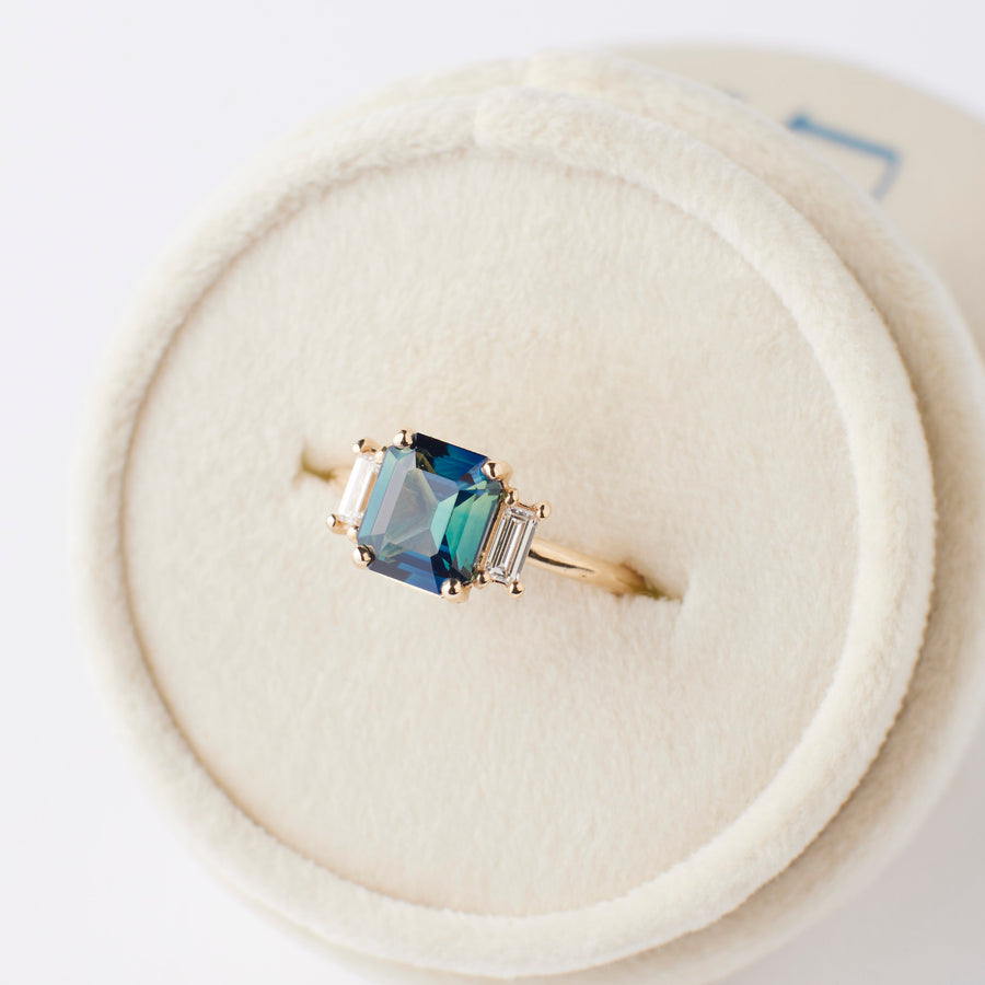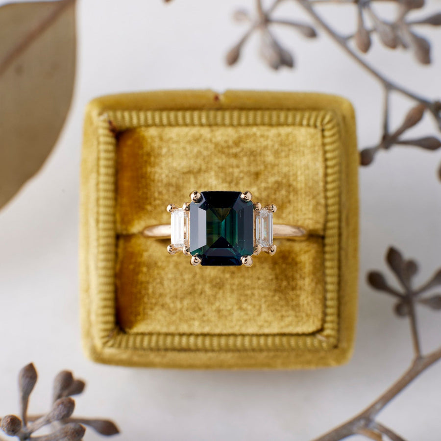 - Set with a 2.52 carat blue green emerald-cut sapphire, unheated and ethically sourced from Madagascar.