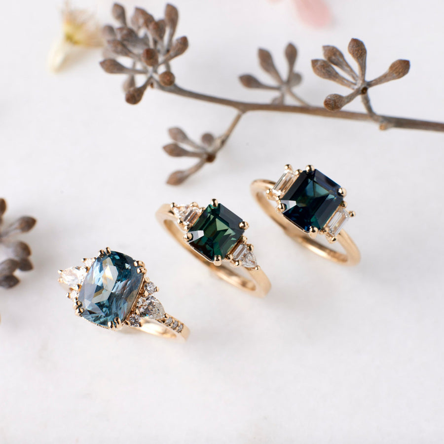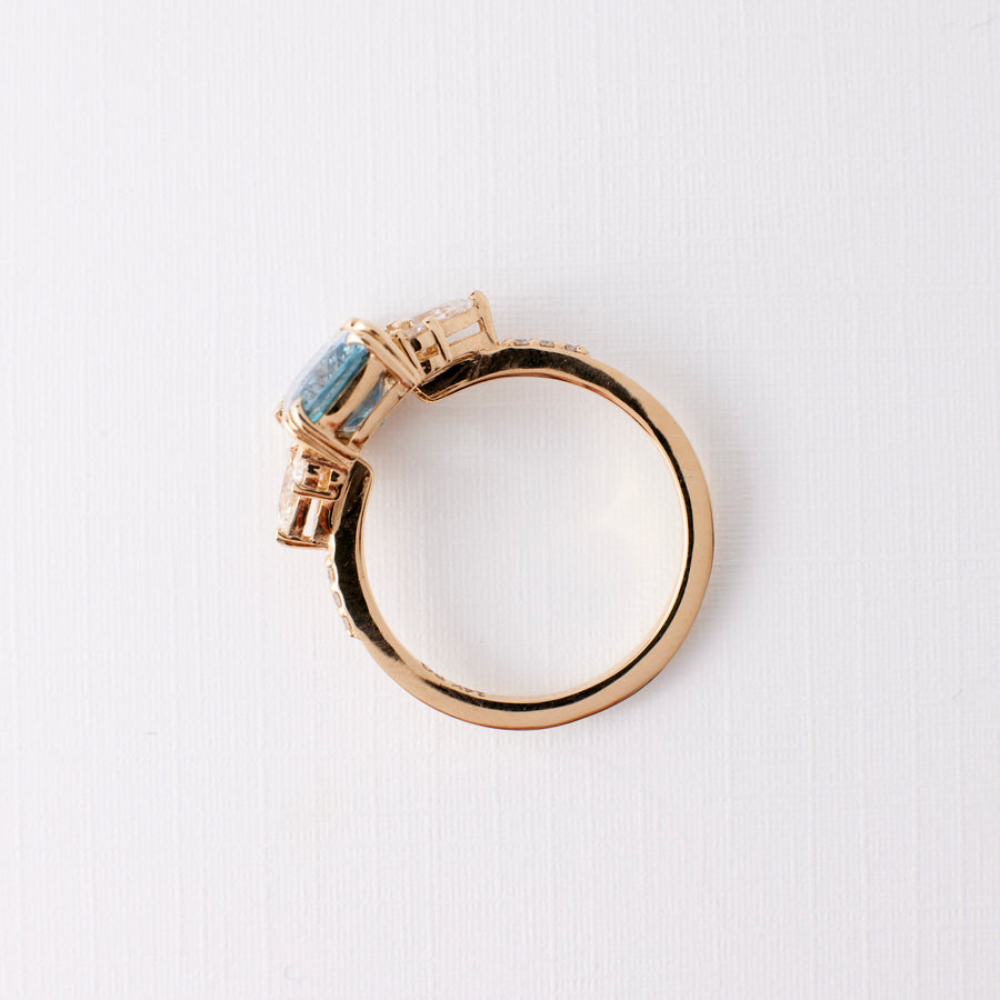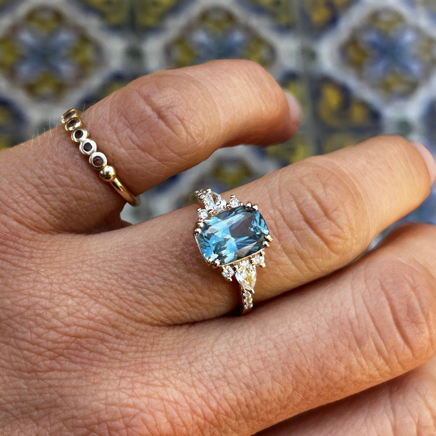 Why it's special: Featuring a gorgeous and substantial 3.06 carat aqua blue cushion cut sapphire that we would say is the perfect color—a serene aqua blue hue that glows in the sunlight. Complemented by pear and round brilliant cut accent diamonds, this ring is a true statement of elegance and sparkle.