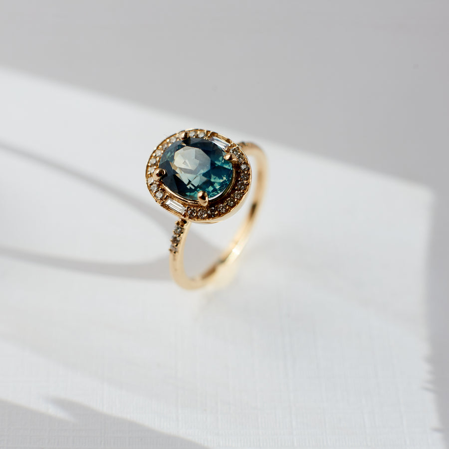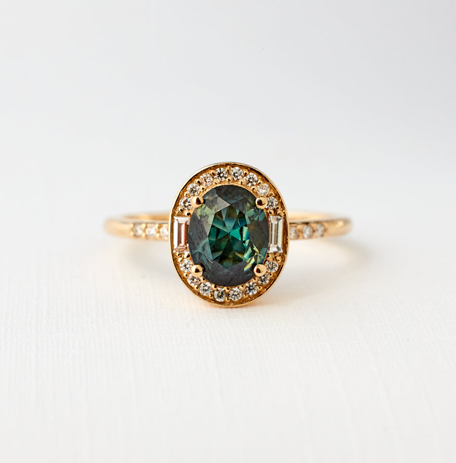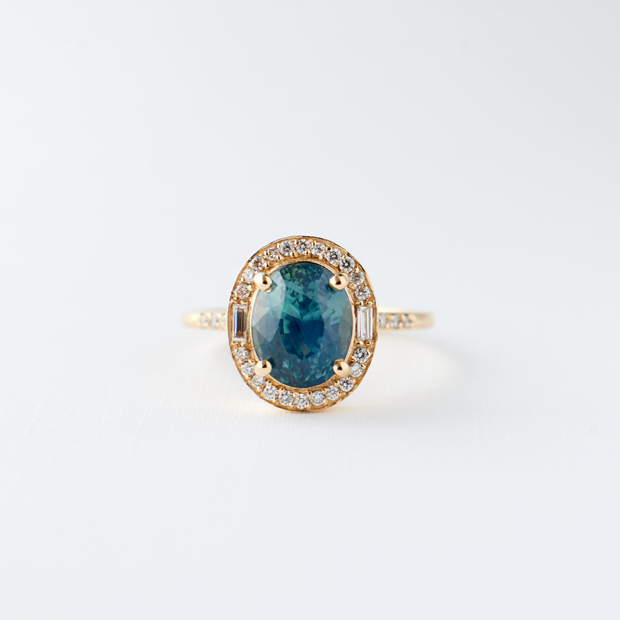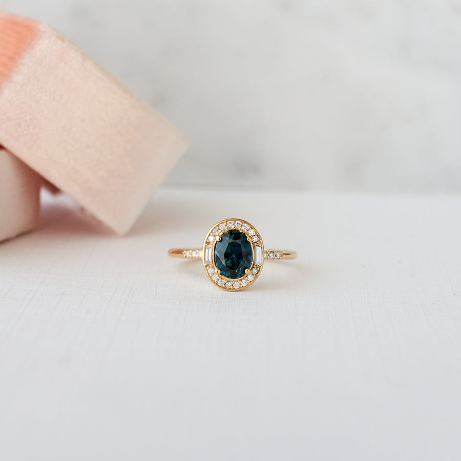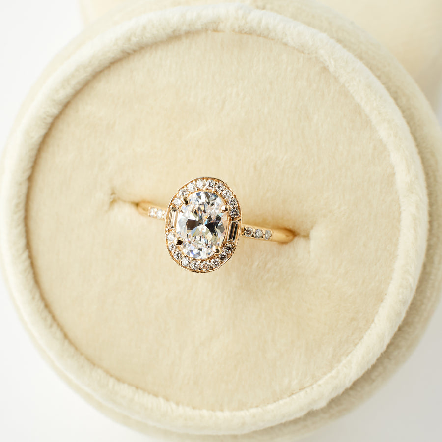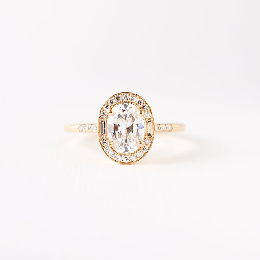 About the Athena: The Athena setting features a delicate halo of baguette and round diamonds.