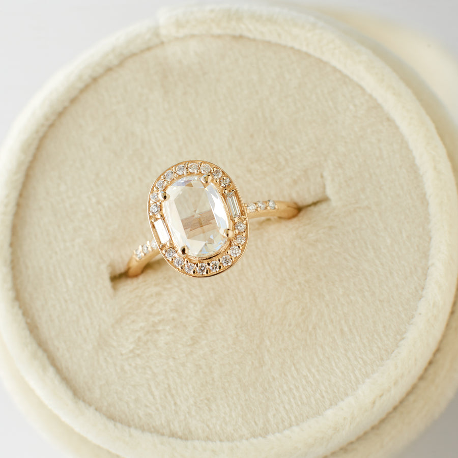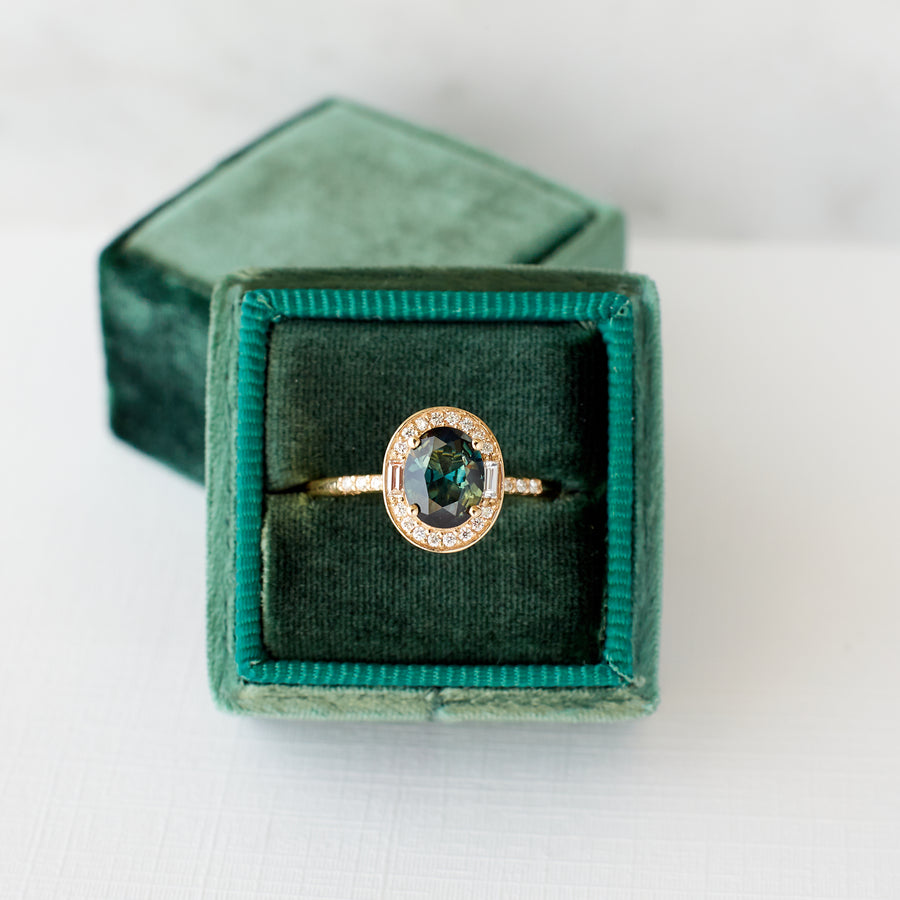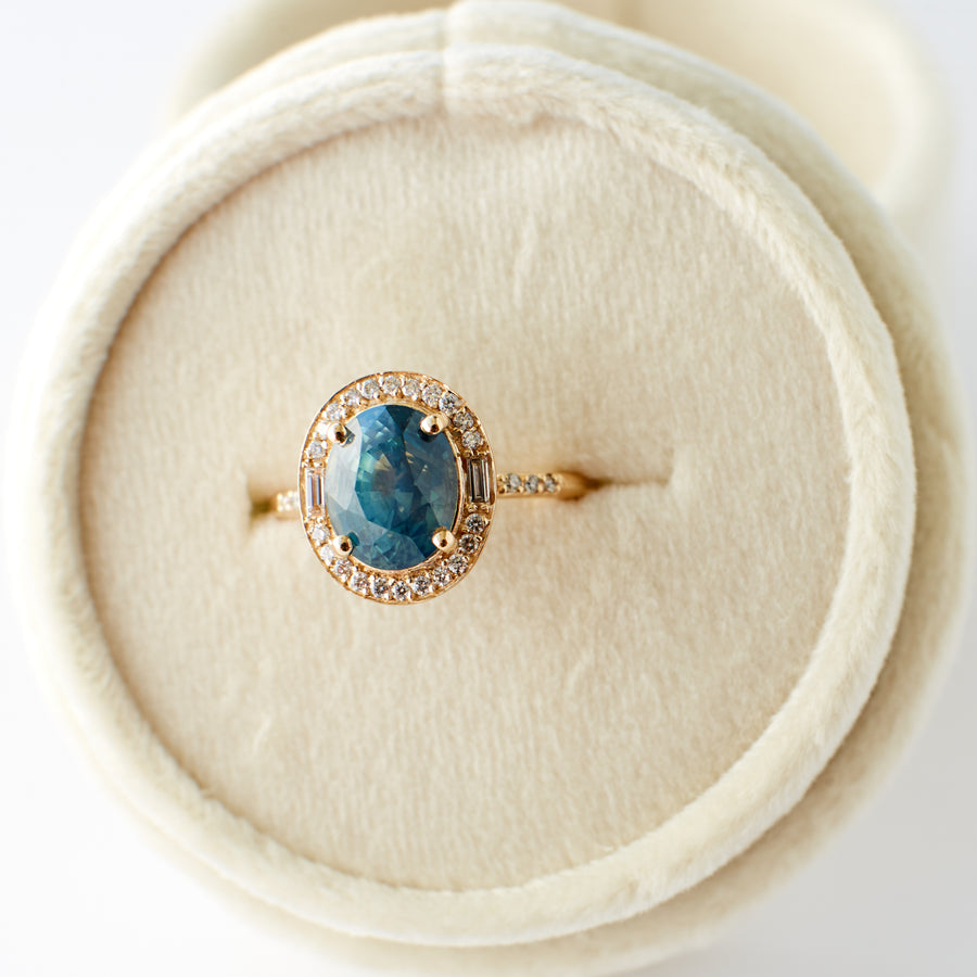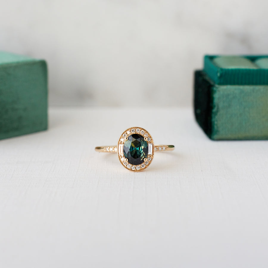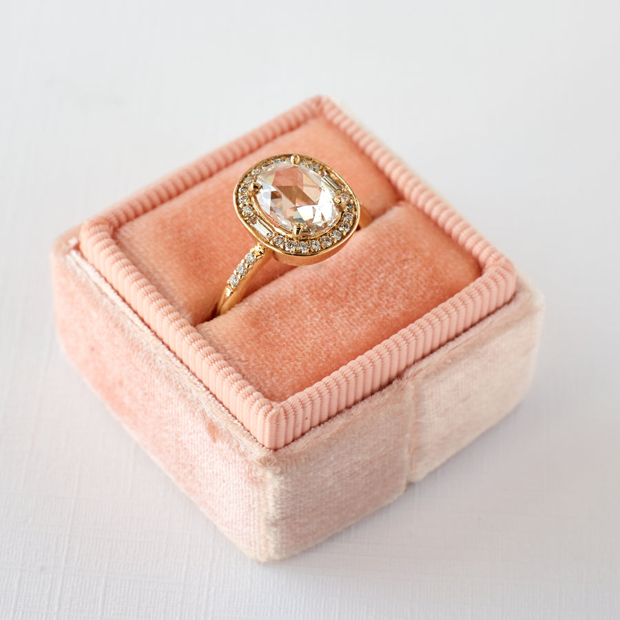 About the Athena: The Athena setting features a delicate halo of baguette and round diamonds.