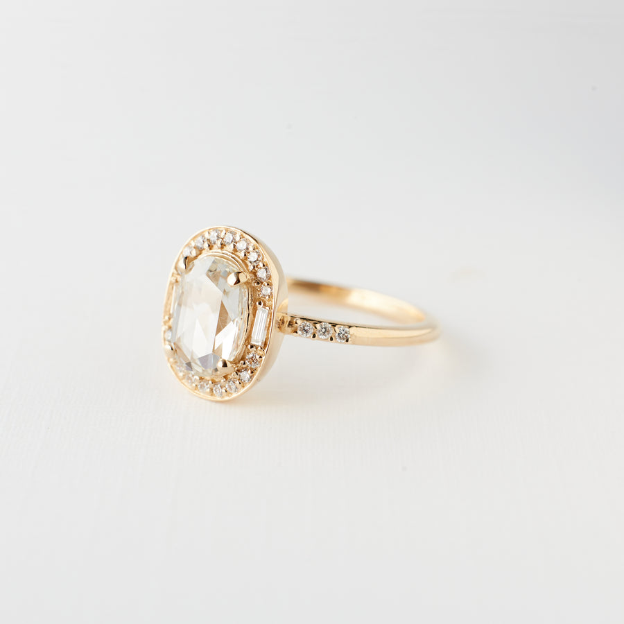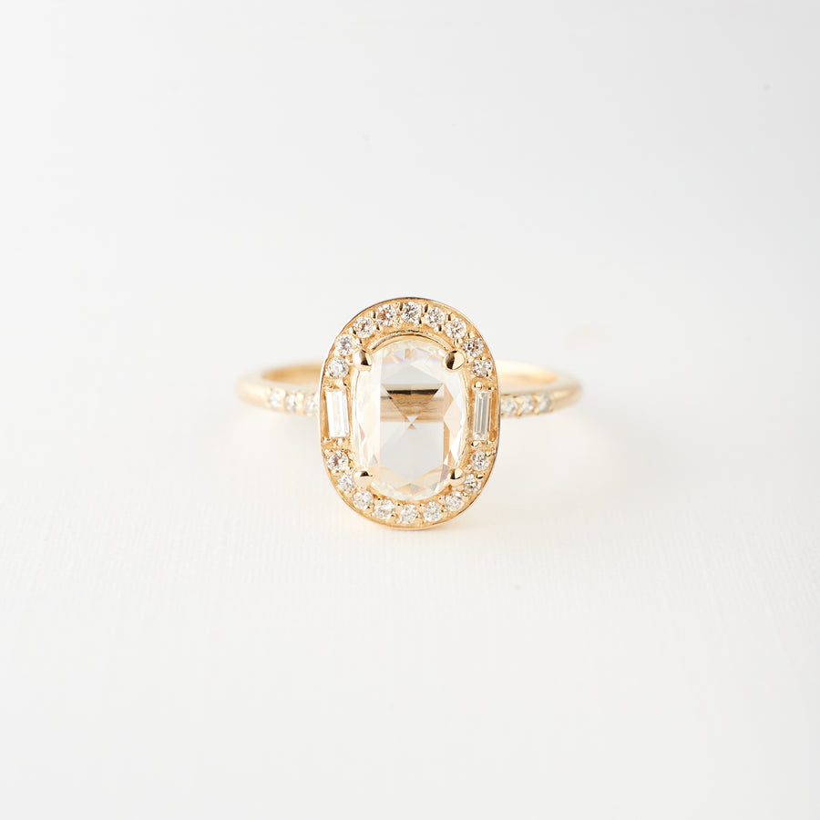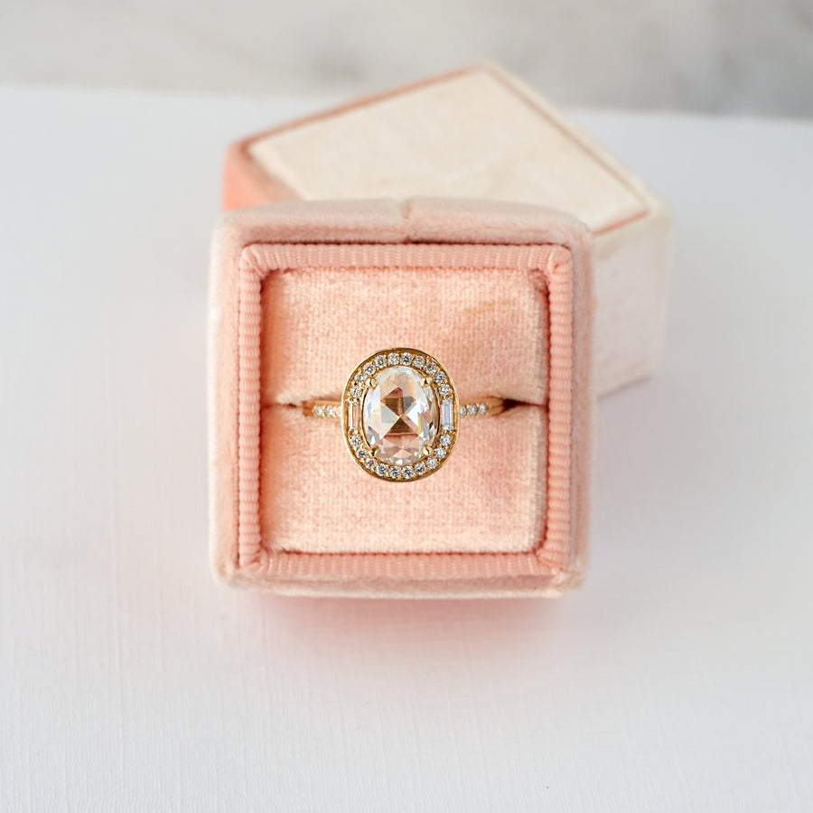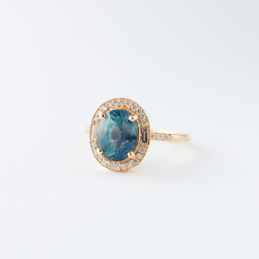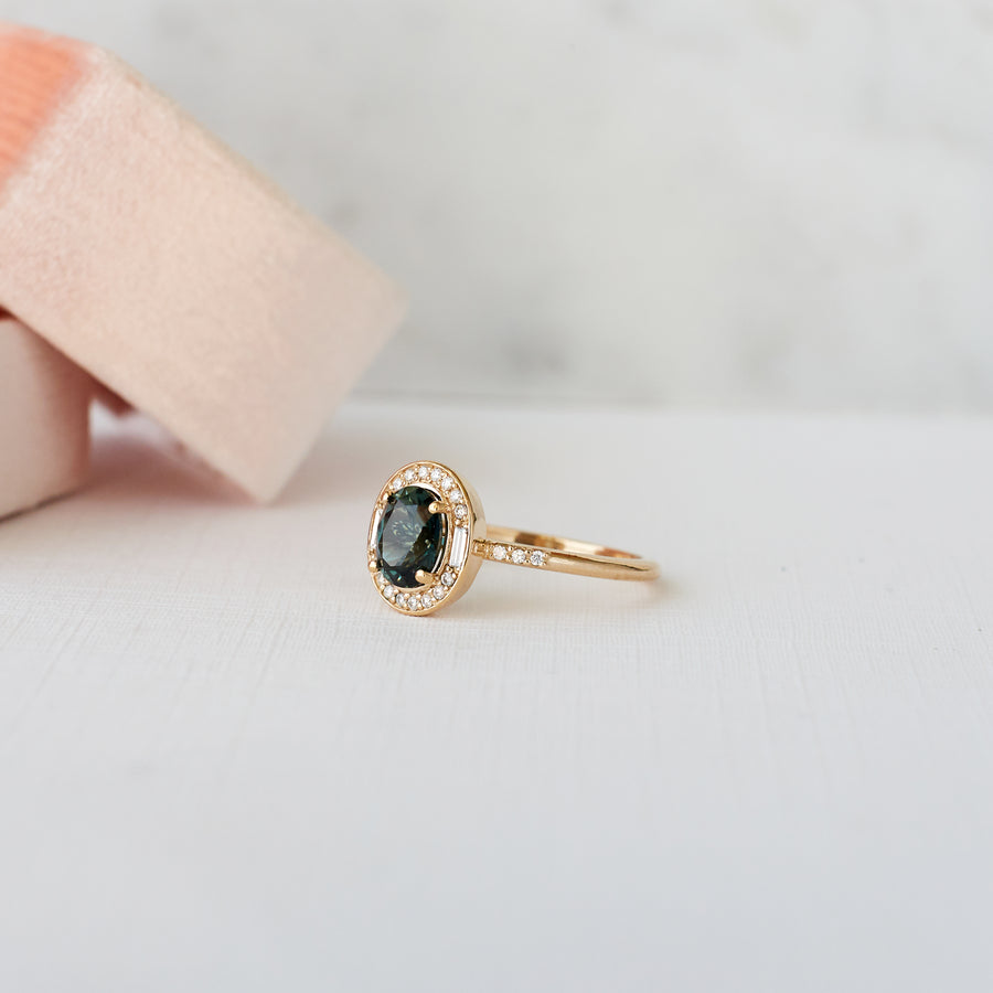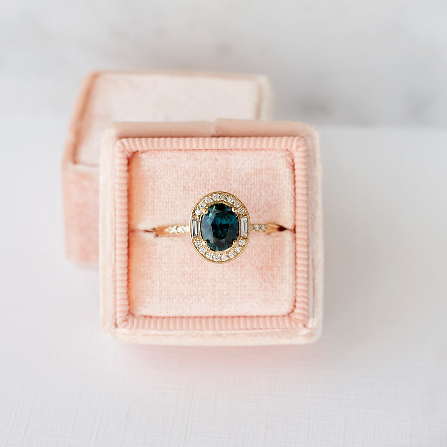 About the Athena: The Athena setting features a delicate halo of baguette and round diamonds.