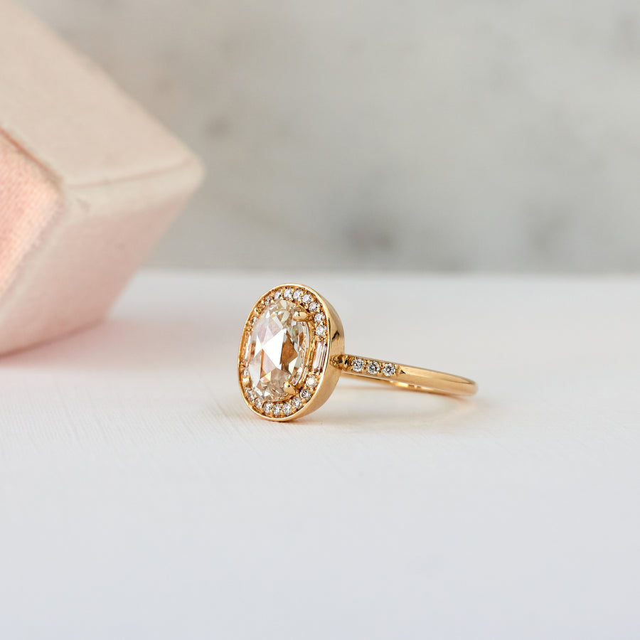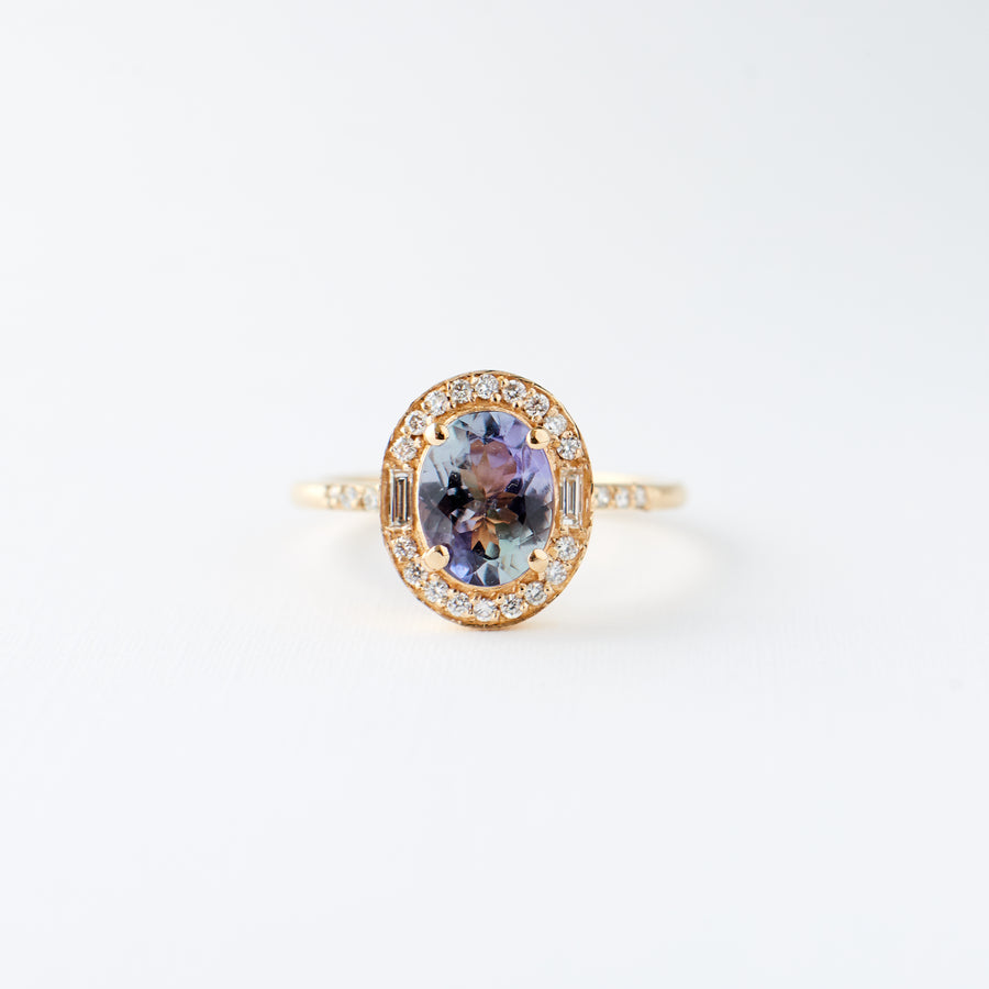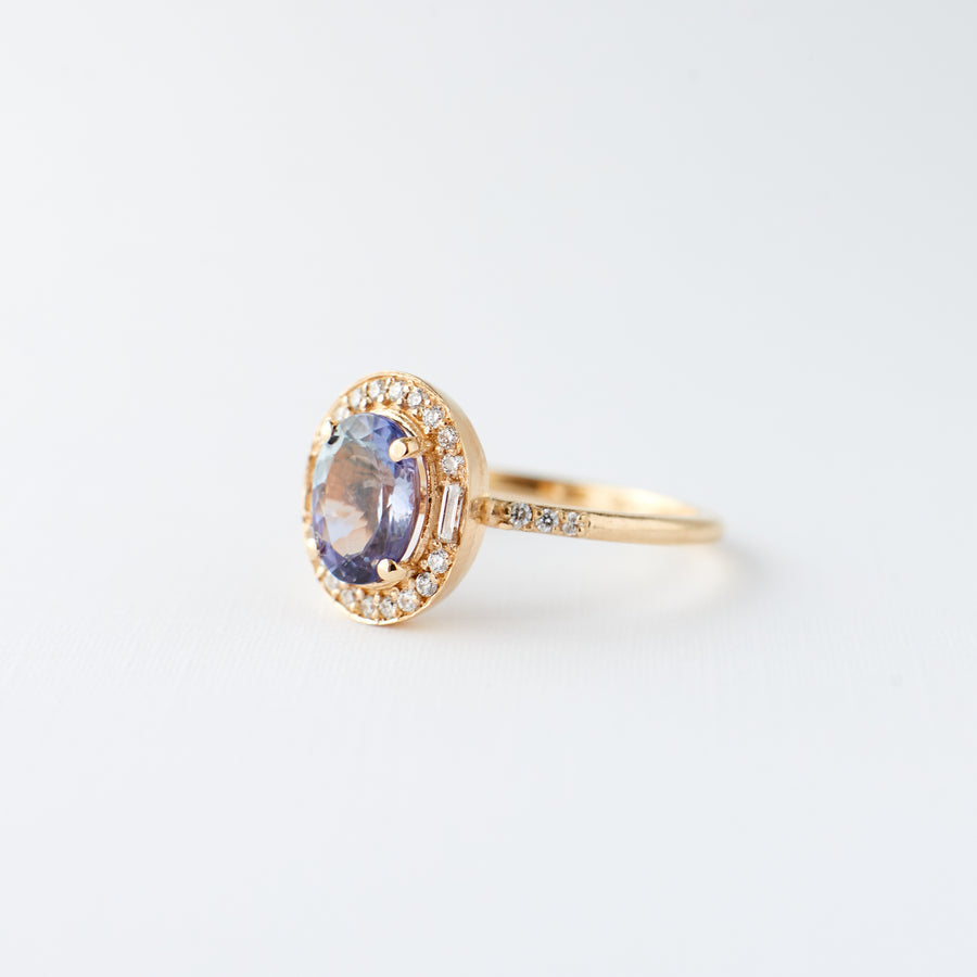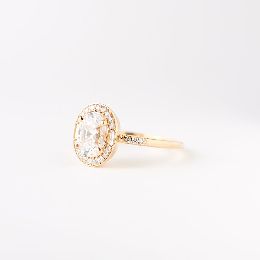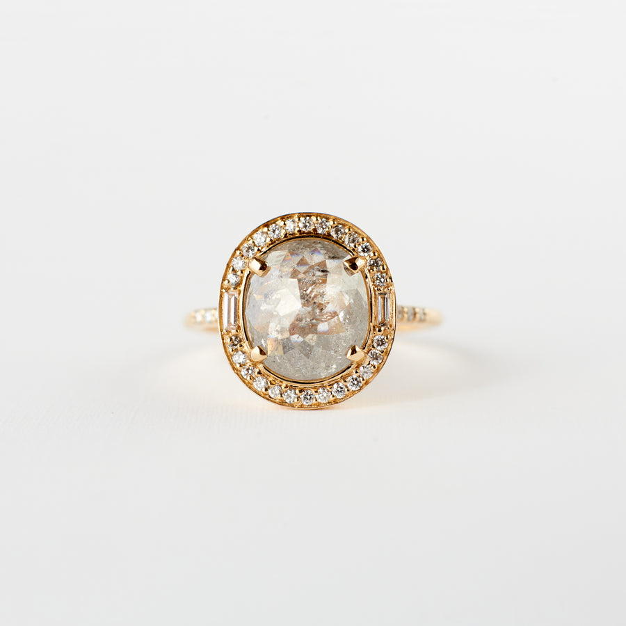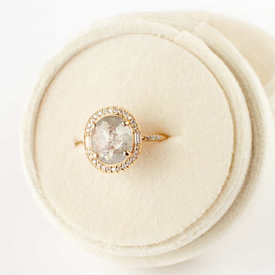 About the Athena: The Athena setting features a delicate halo of baguette and round diamonds.