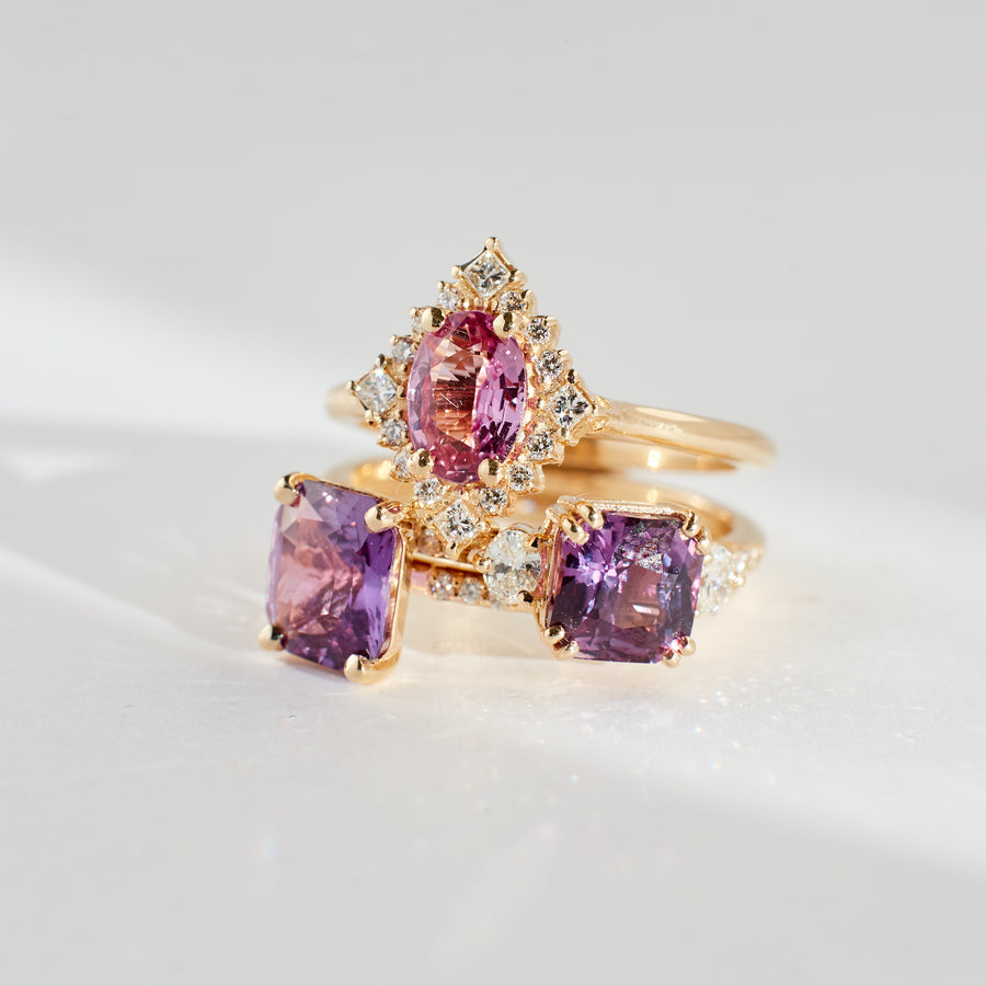 Our Ashia setting is one of our favorites for showing off an incredible gemstone, so it was an immediate design match when we found this pink-purple, radiant-cut sapphire. The 1.55 carat stone shines front and center and is accented by 0.03 carats of natural white diamonds—giving this one-of-a-kind sapphire the spotlight it deserves!