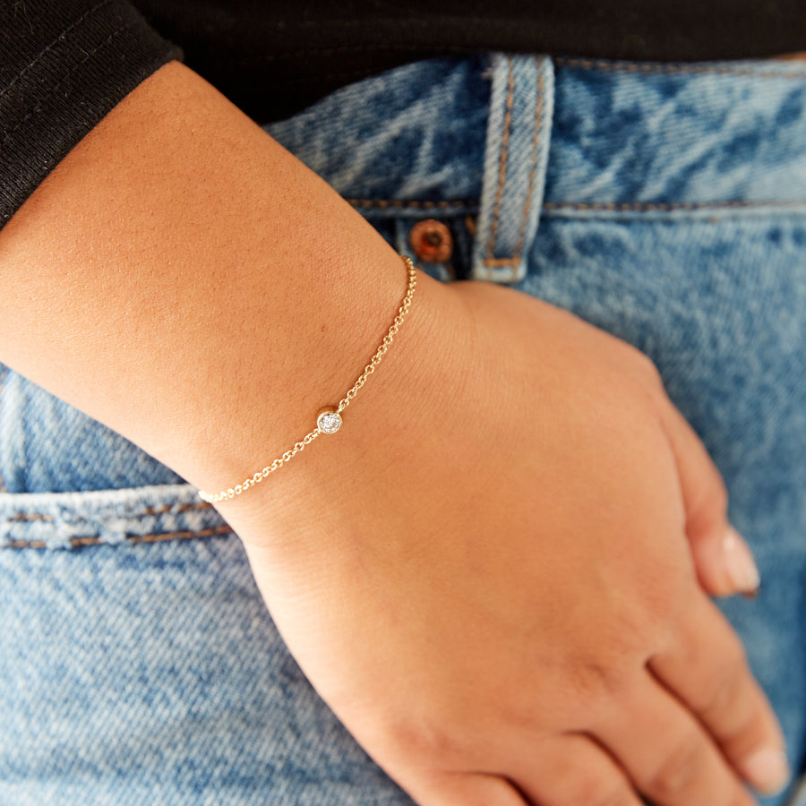 Meet your perfect layering bracelet. Made with a single lab-grown diamond in a bezel setting on a 14 karat gold chain, our Ellie bracelet is simple and elegant with a lot of sparkle. We love it mixed into a medley of gold bracelets!
