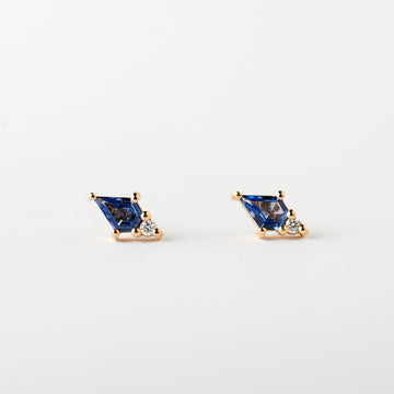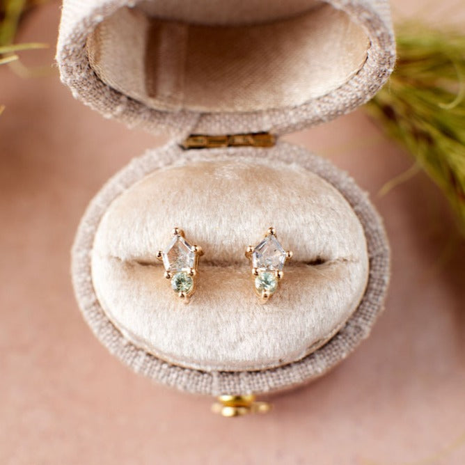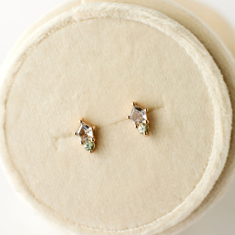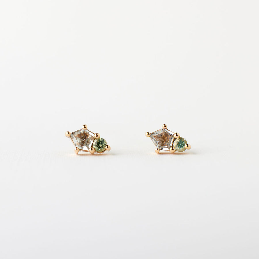 Elevate your earring collection with these adorable Pixie earrings, showcasing a shield-shaped white sapphire paired with a round green sapphire for a touch of elegance and charm in every detail.