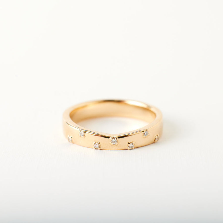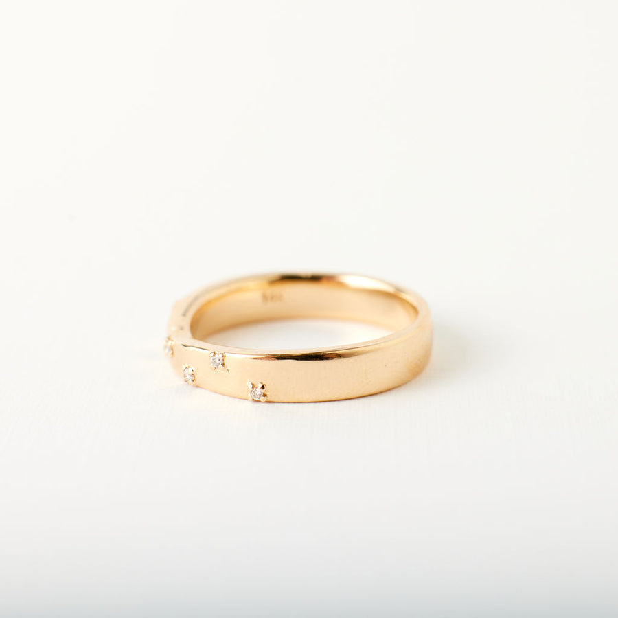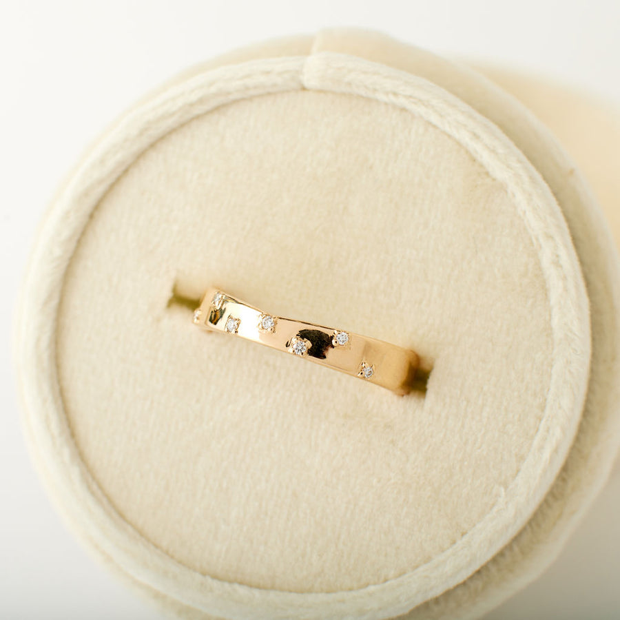 Our Celeste ring is made of 14 karat gold that shimmers with celestial charm. Its slightly tapered shape adds a touch of elegance, while the name pays homage to its star-like allure. Adorned with 7 petite white diamonds, this ring sparkles with a delicate radiance. Perfect as a standalone statement piece or as the foundation for a stack of rings. It also pairs flawlessly with a range of engagement ring styles.
