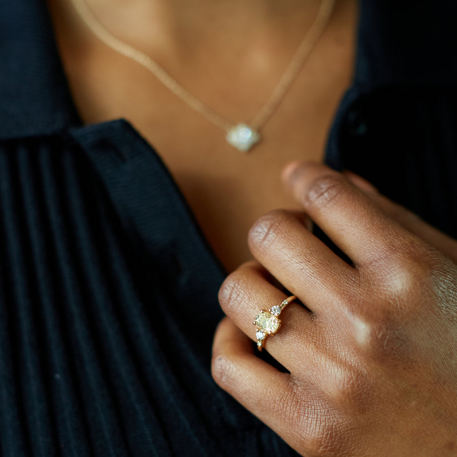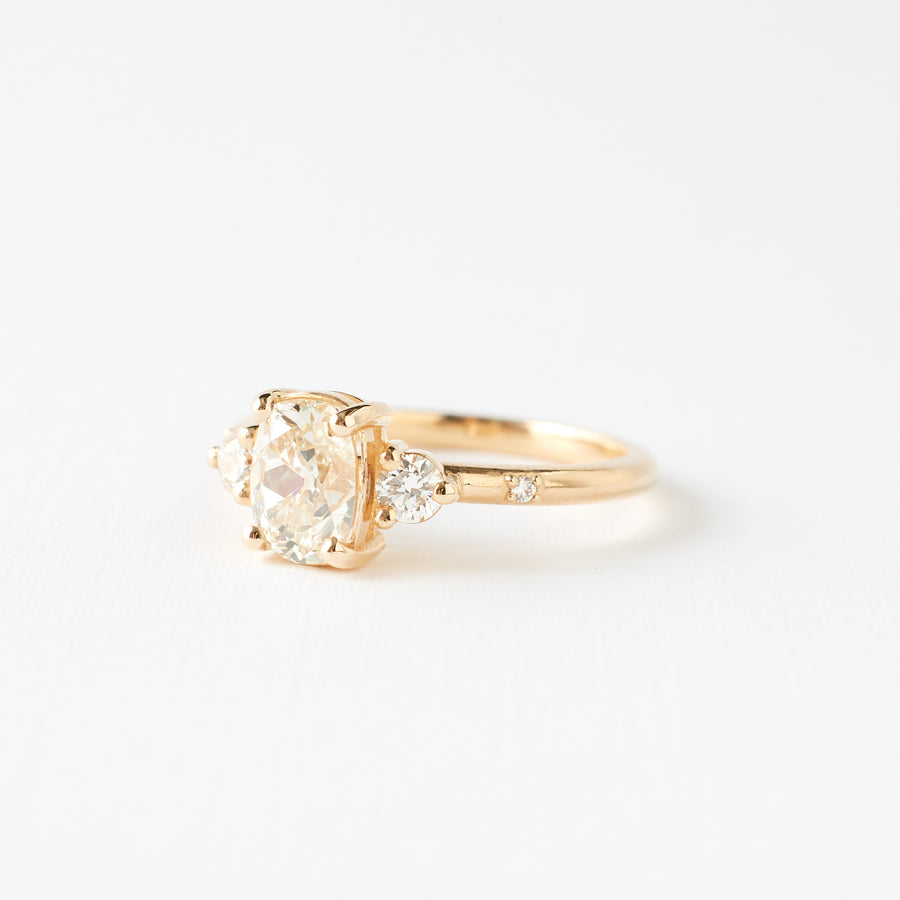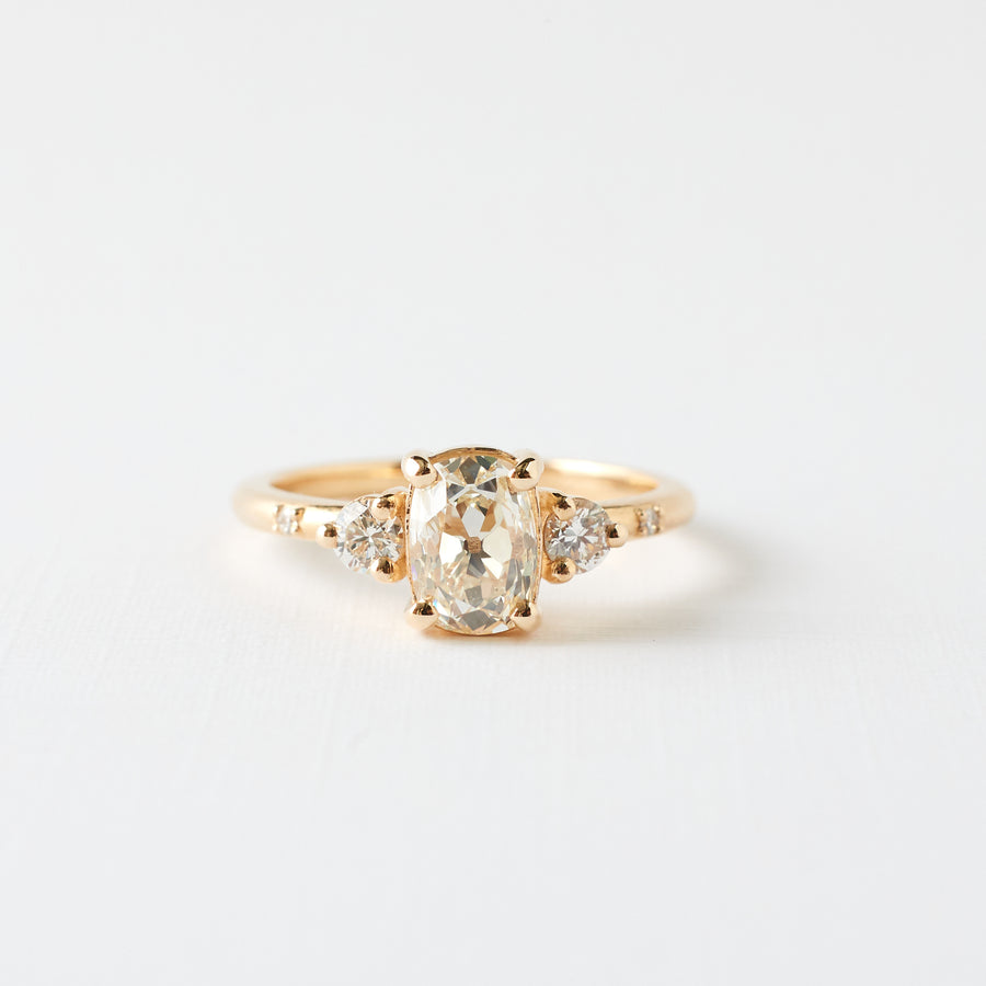The Clio ring is a modern take on a classic design. Featuring a 1.16 carat, antique-style diamond that was cut to resemble old mine cut diamonds, the center stone has an undoubtedly vintage aesthetic. Accented by two small diamonds on the band, this three-stone ring is timeless—a perfect style for the one who cherishes the charm of decades past and the beauty of enduring design.