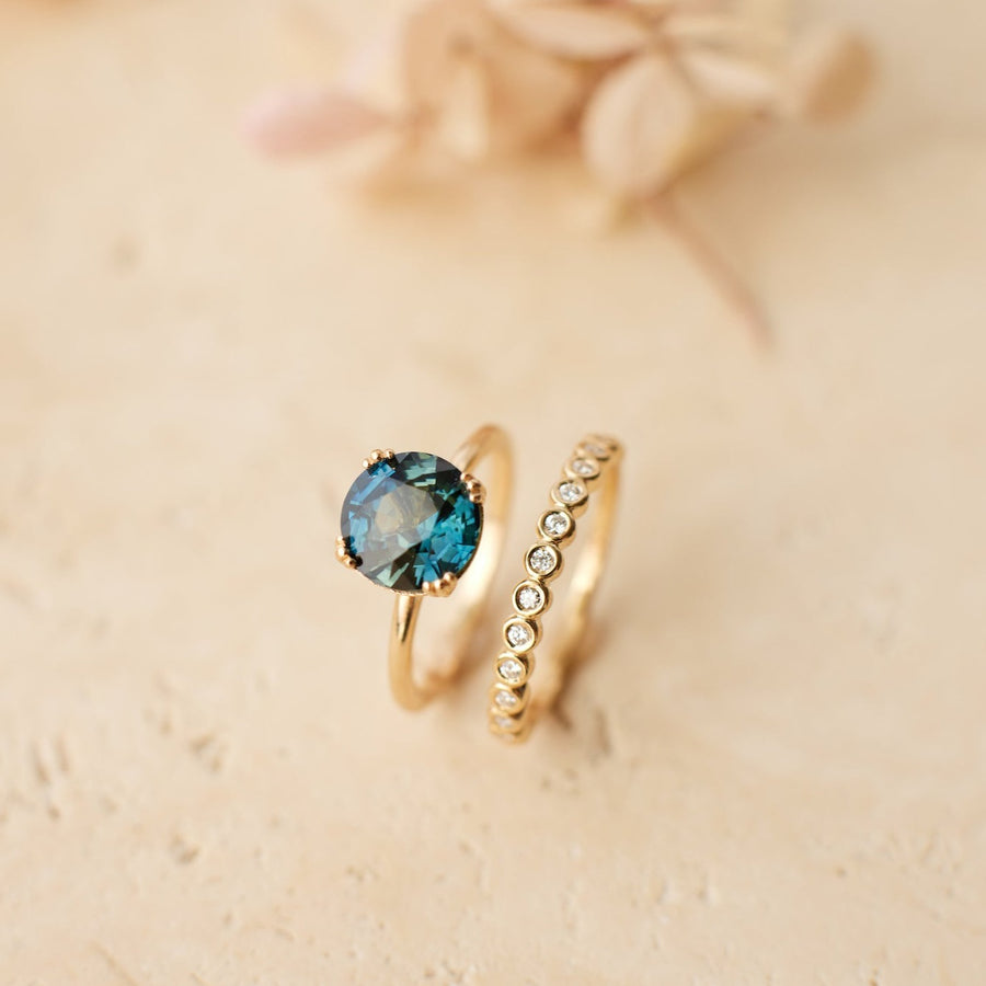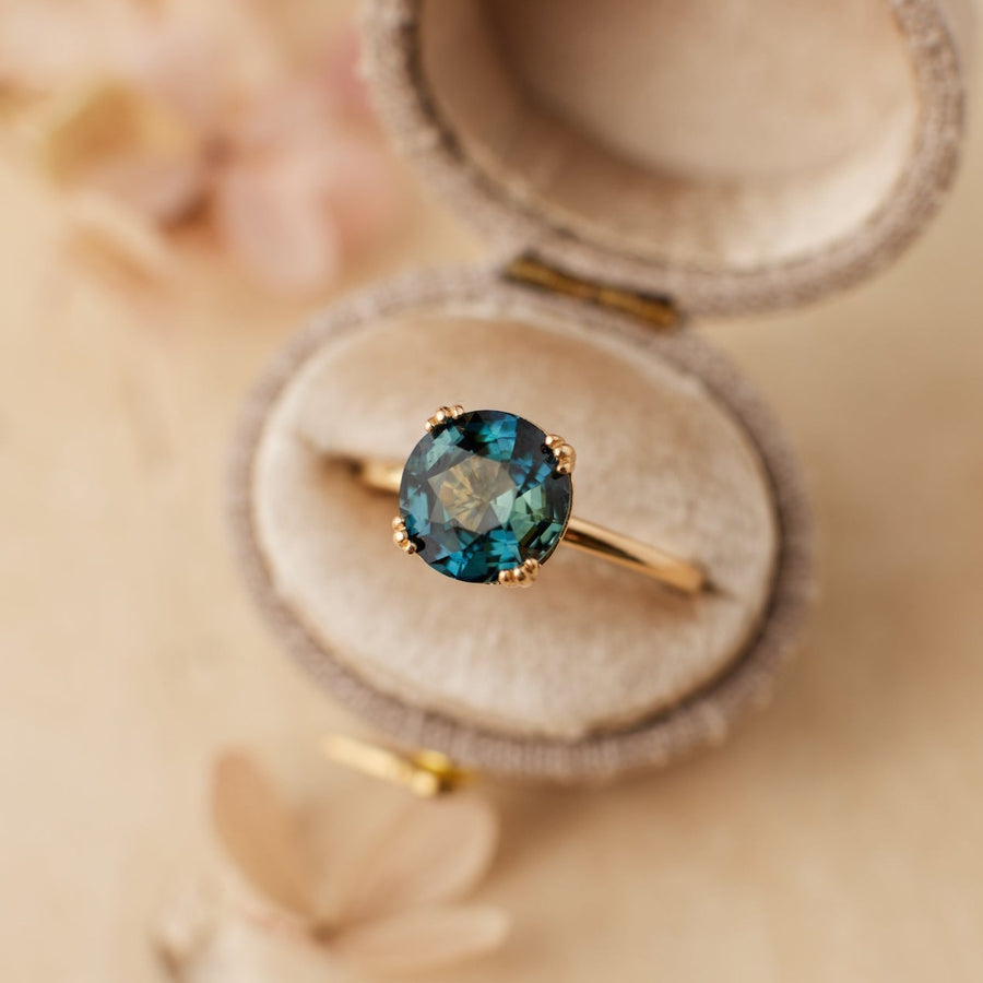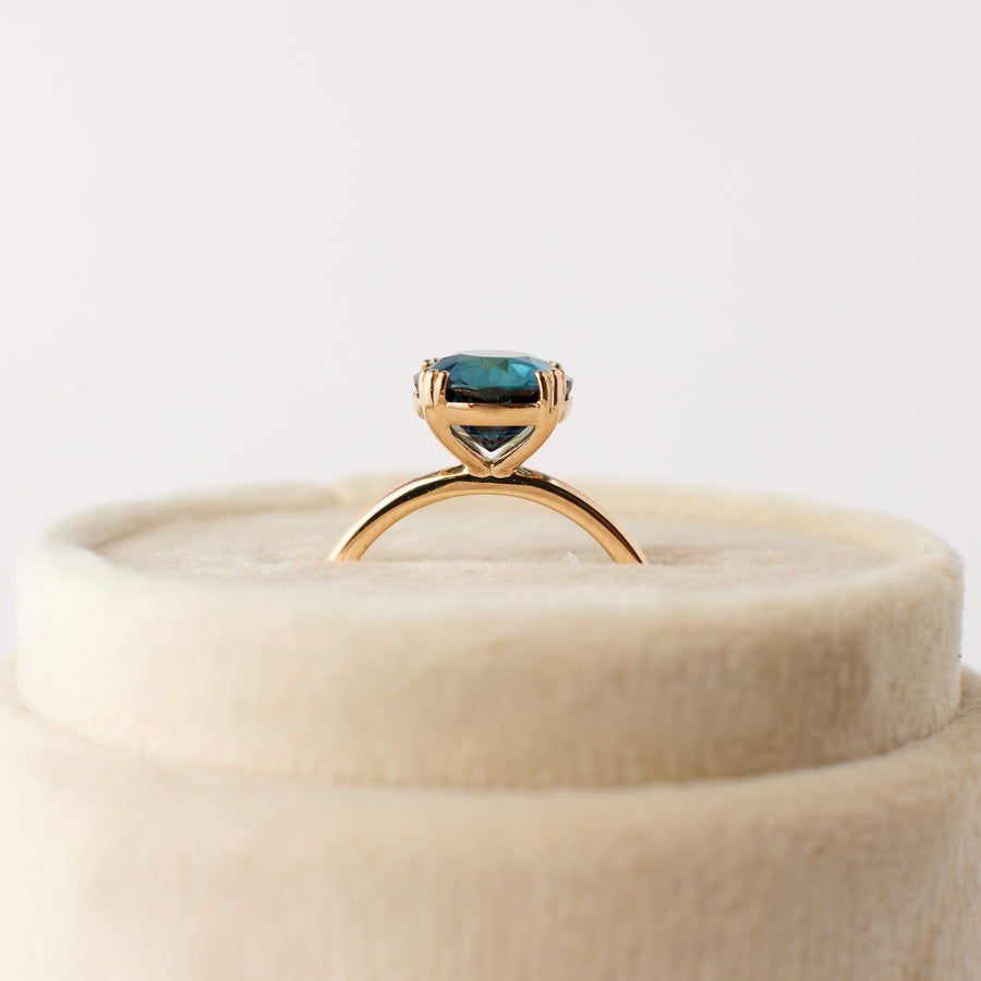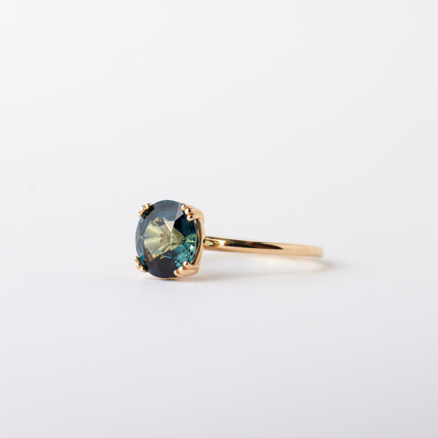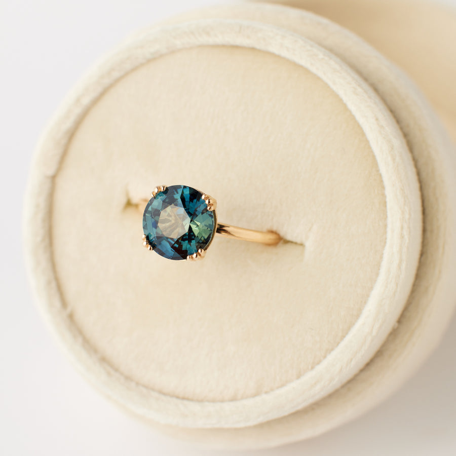 Our latest Kennedy ring pays homage to the uniqueness of sapphires! Featuring a 3.09 carat blue-green-teal sapphire, this jaw-dropping, one-of-a-kind gem sparkles in any light. Set in a classic solitaire design with triple prongs for a touch of vintage charm in a grounded and elegant style.