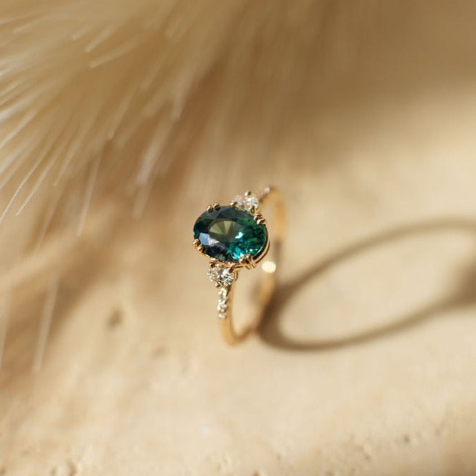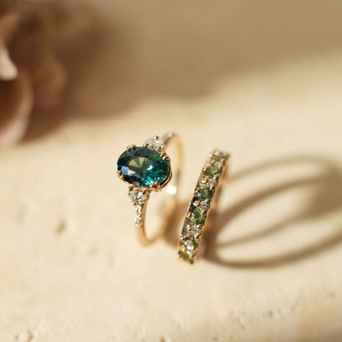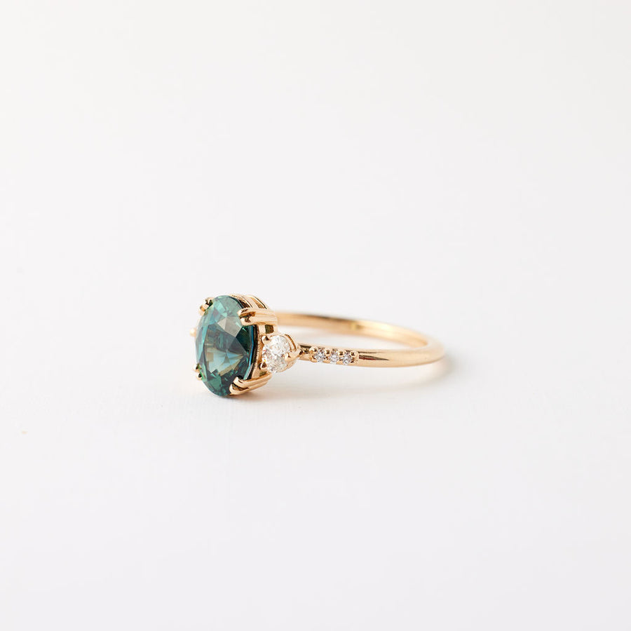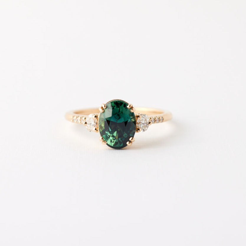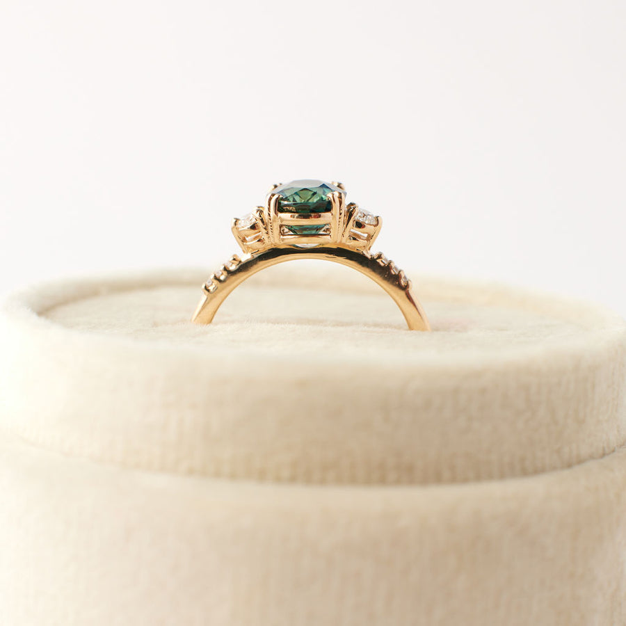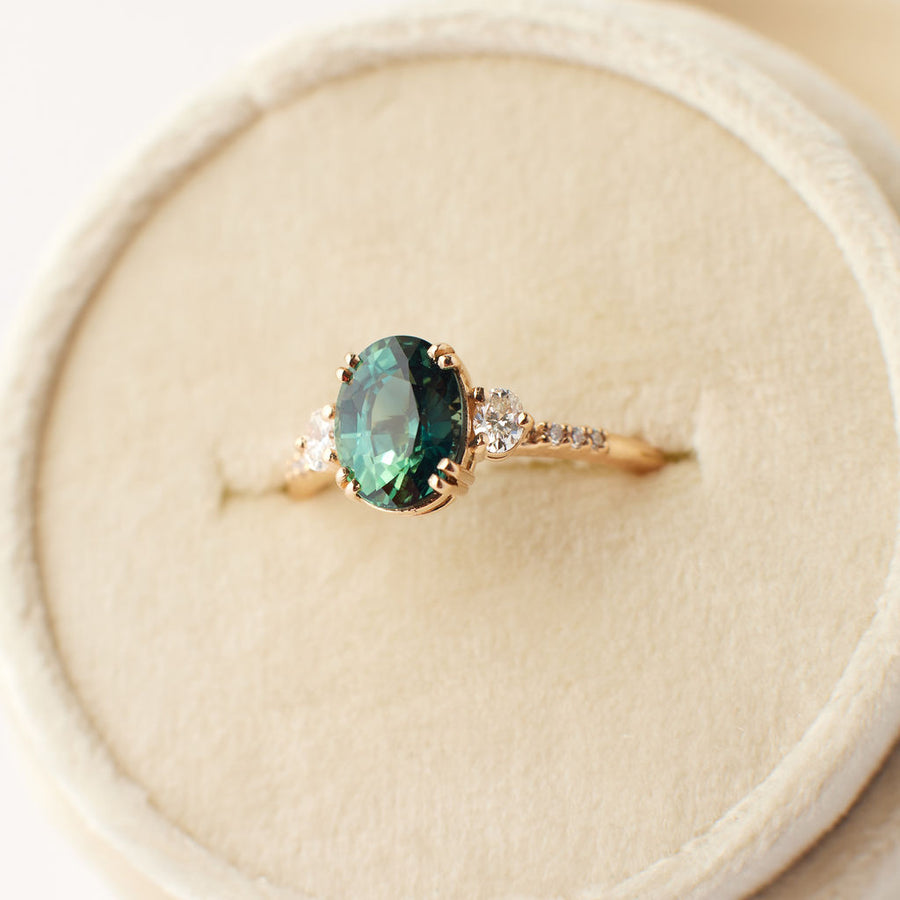 - Set with a 2.02 carat oval, green-teal sapphire (eye-clean and unheated); ethically sourced from Madagascar.