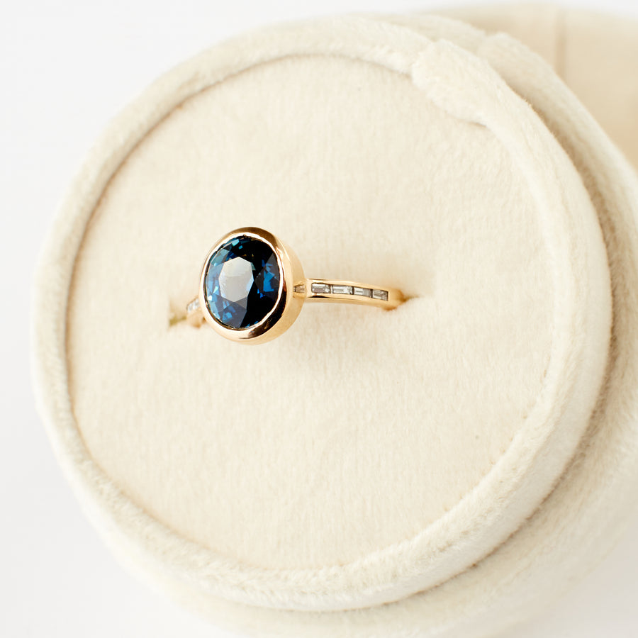 Bevel-setting lovers, this ready-to-ship Presley ring is for you. Set with a magnificent 2.16 carat oval sapphire that shines teal, green, and blue, this soft, round design puts the focus on this moody blue stone.
